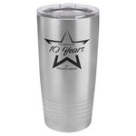 Polar Camel 20 Oz. travel mugs feature double-wall stainless steel, vacuum insulation with a clear lid featuring the Polar Camel logo. It has a narrower bottom to fit most standard cup holders. They are 2X heat and cold resistant compared to normal travel mugs and serve as a great way to get your company's name out there, as well as a reminder to your customers where to come back for great drinks. Laser Engraved. Minimum order 24.  3 3/8" Diameter x 6 7/8" H x 3/16" Thick